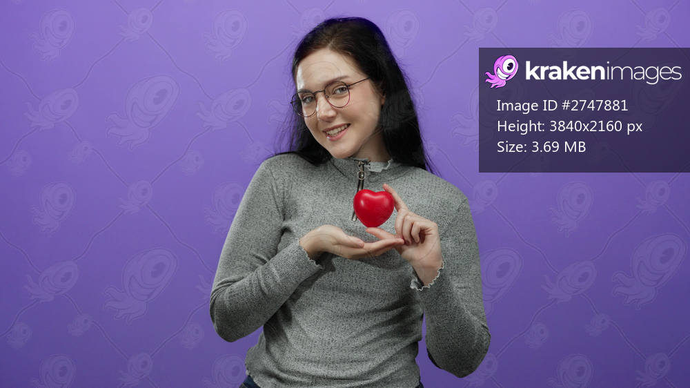 Brunette woman holding red heart smiling against vivid purple background suggests love and happiness with playful gestures wearing glasses and gray sweater. - Kraken Images