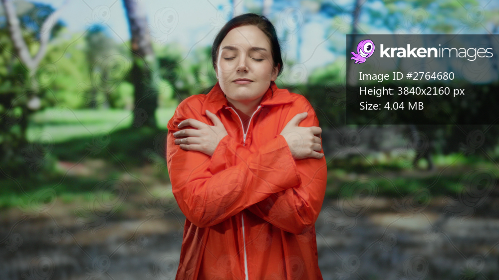 Brunette woman in an orange prison jumpsuit embraces herself peacefully in a lush green park setting, conveying introspection and solitude outdoors.