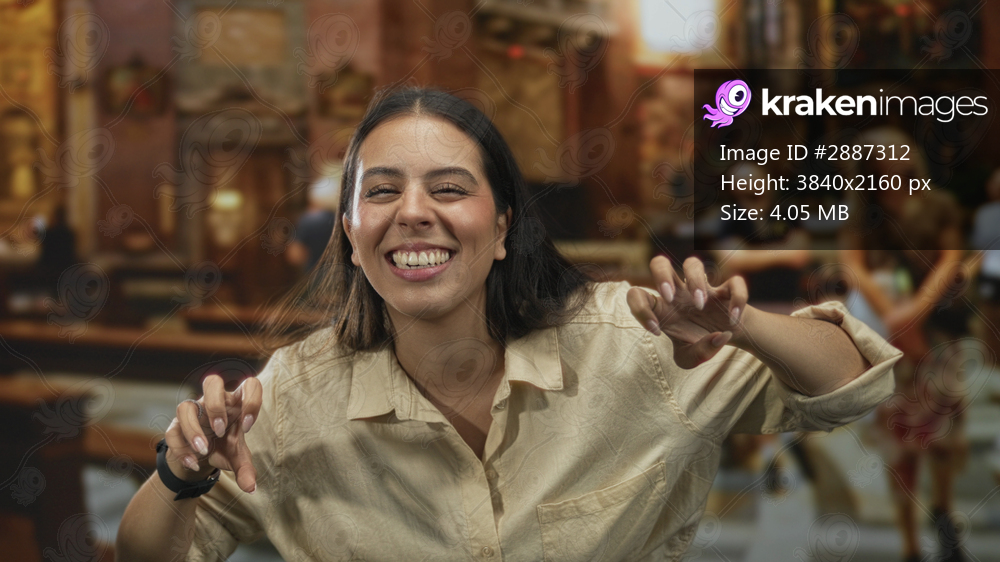 Brunette woman laughing with hands raised inside ornate church building, leaning forward and smiling broadly; playful joy.