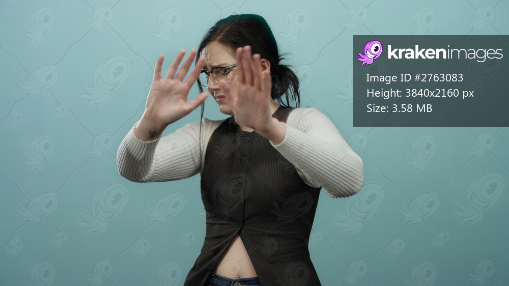 Brunette woman looking scared with hands raised against a blue background, expressing fear and surprise in an emotional moment.