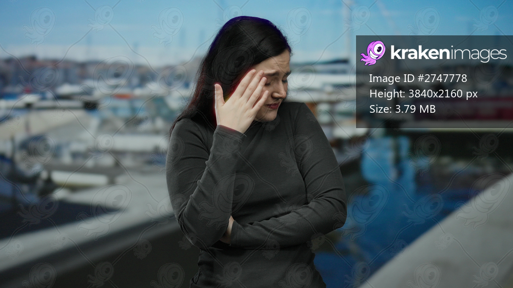 Brunette woman making expressions at a port with ships docked, highlighting emotions and maritime setting.