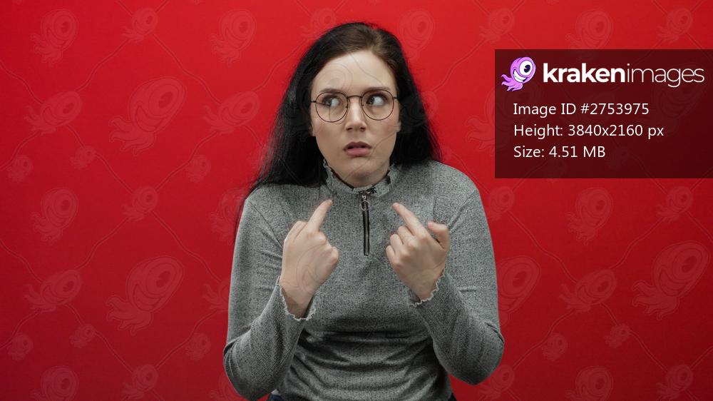 Brunette woman pointing at herself with surprise against a bold red background wearing glasses and a gray sweater conveying a sense of inquiry or disbelief. - Kraken Images