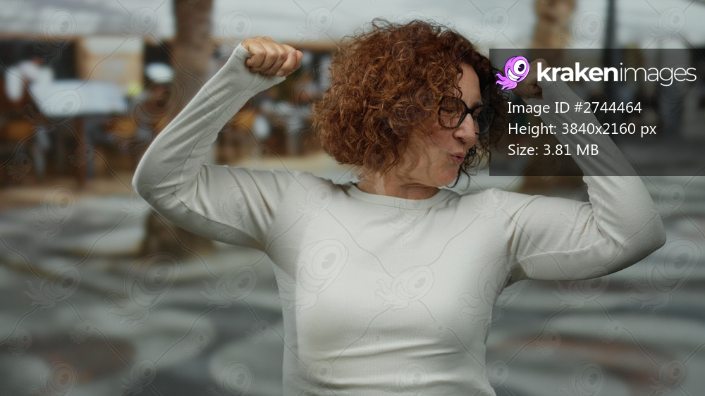 Brunette woman showing strength with raised arms on a restaurant terrace offering a confident expression in an outdoor setting.