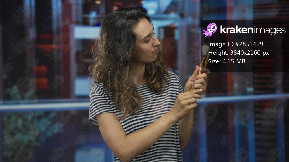 Brunette woman wearing a striped shirt carefully examining makeup brushes in a hotel interior; curiosity.