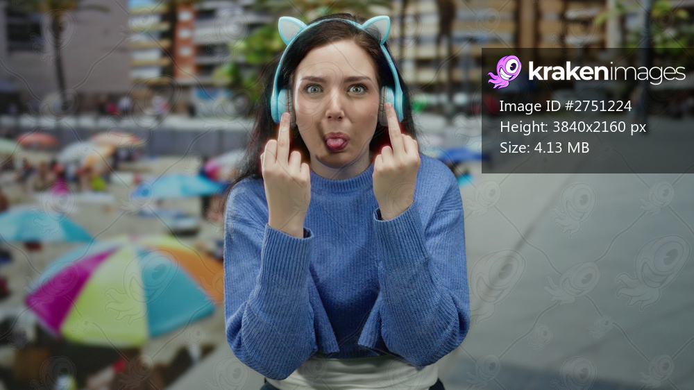 Brunette woman wearing headphones makes a playful gesture with both hands while standing on a lively beach scene with colorful umbrellas.