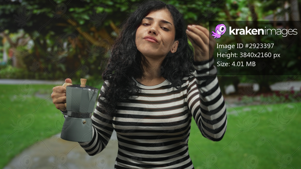Brunette young arab woman holding gray coffeemaker with pinched fingers gesture in green park outdoors; mild frustration.