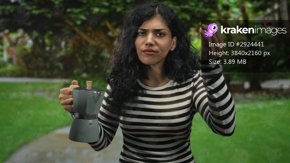 Brunette young arab woman holding gray coffeemaker with pinched fingers gesture in green park outdoors; mild frustration.