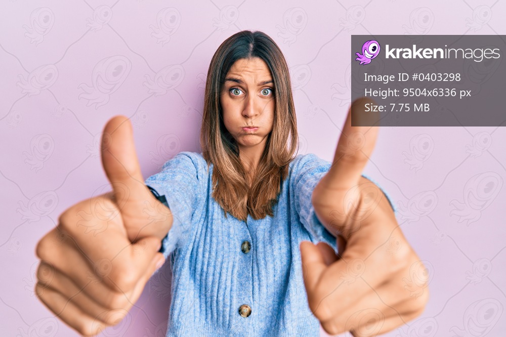 Brunette young woman doing thumbs up positive gesture puffing cheeks with funny face. mouth inflated with air, catching air.