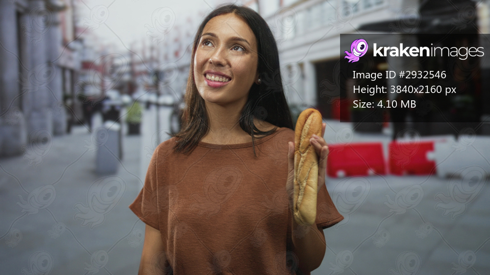 Brunette young woman holding a baguette with one hand on a busy city street near red barriers, smiling and looking upward; everyday joy.