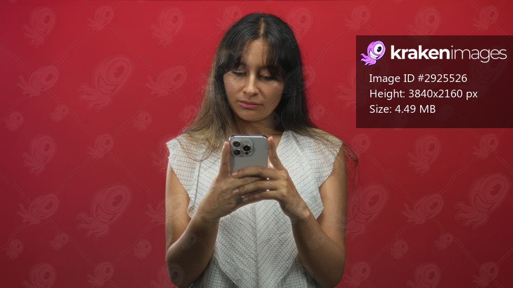 Brunette young woman texting on smartphone with visible hands in red studio, looking down at screen; focused concentration.