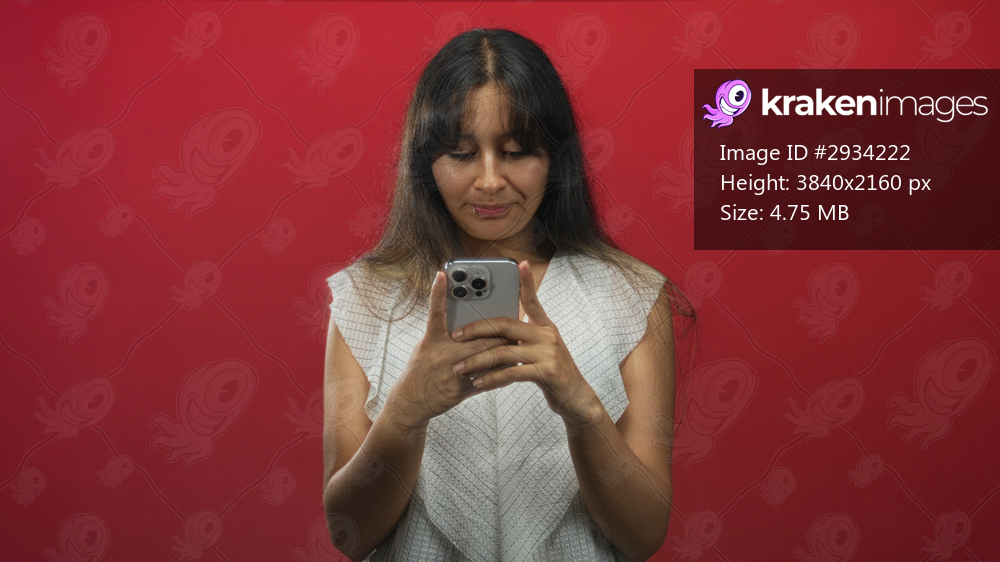 Brunette young woman texting on smartphone with visible hands in red studio, looking down at screen; focused concentration.