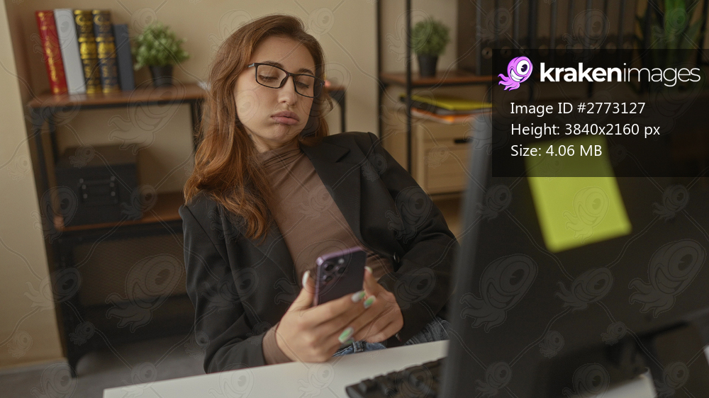 Businesswoman in glasses with a phone reclines in an office chair at her desk with bookshelves in background showing modern work environment and professional attire. - Kraken Images