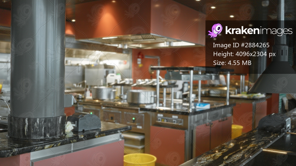 Busy restaurant kitchen with stainless steel counters and equipment, softly blurred with shallow focus interior; copyspace backplate overlay.