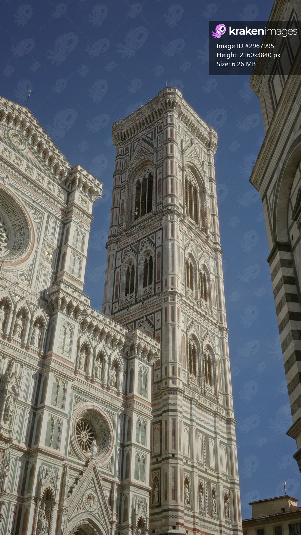 Campanile and cathedral facade standing tall with detailed green white and pink marble ornament, rose window and statues on a building in florence italy; awe. - Kraken Images