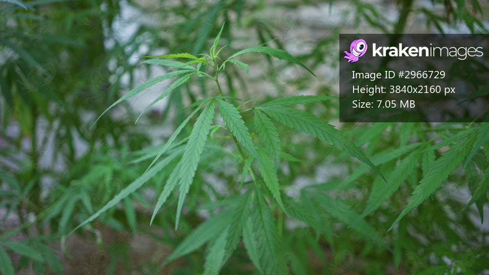 Cannabis plant with serrated leaf growing beside building wall, slender stems and emerging shoots visible; natural serenity.