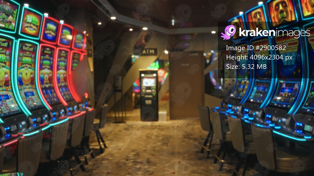 Casino slot machine rows defocused bokeh corridor with neon lights and carpeted floor; background backplate copyspace template.