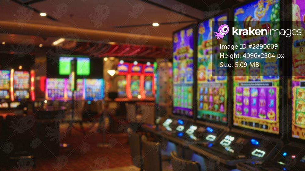 Casino slot machines and neon screens softly defocused with shallow bokeh across a dimly lit interior gaming floor; background backdrop copyspace template.