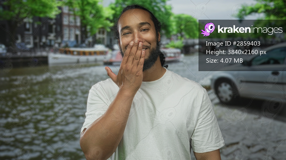 Casual man covering mouth with hand while smiling in white t shirt on street by amsterdam canal with boat and parked car near bridge; playful warmth.