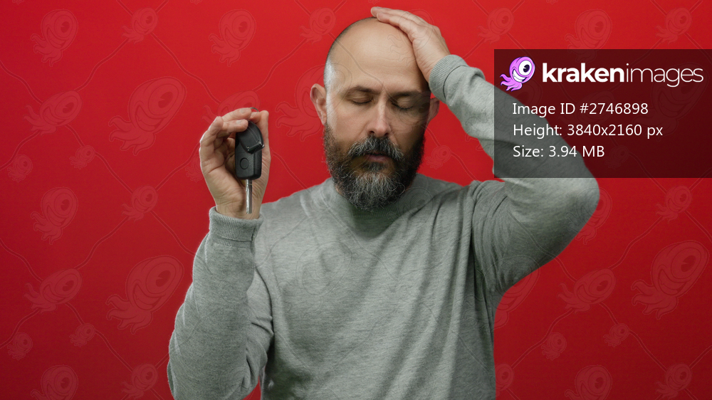 Caucasian bald man with a beard looks distressed holding car keys against a striking red background, wearing a casual gray sweater, evoking a sense of forgetfulness or loss. - Kraken Images