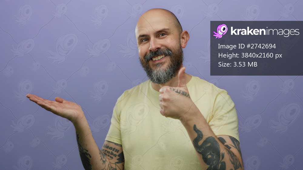 Caucasian bearded man with tattoos points to open hand while smiling against an isolated purple background