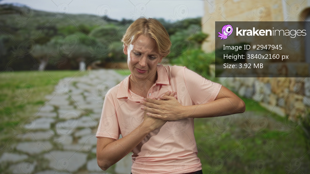 Caucasian blond woman clutching chest with hand on hip, possible heartattack, standing on cobblestone path by a stone building; distress.