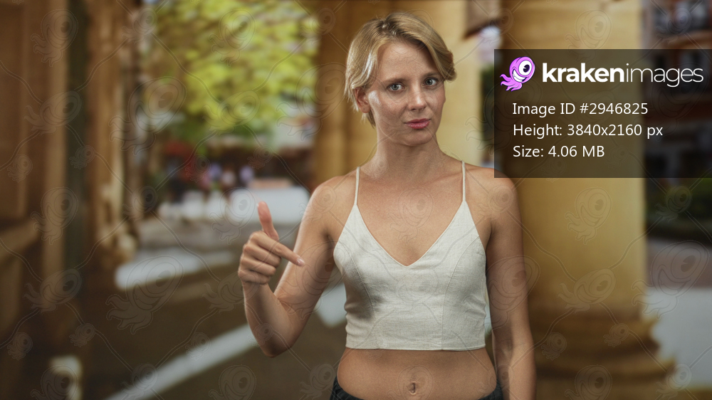 Caucasian blond woman in a white crop top gestures thumbs up and points with her finger in a colonnaded street; confidence.
