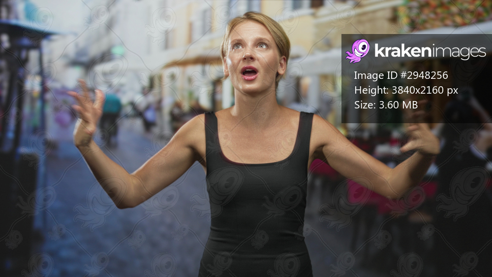 Caucasian blond woman in black tanktop points finger to chest and gestures with open hands on a busy street cafe, eyes closed mid speech; sincere plea. - Kraken Images