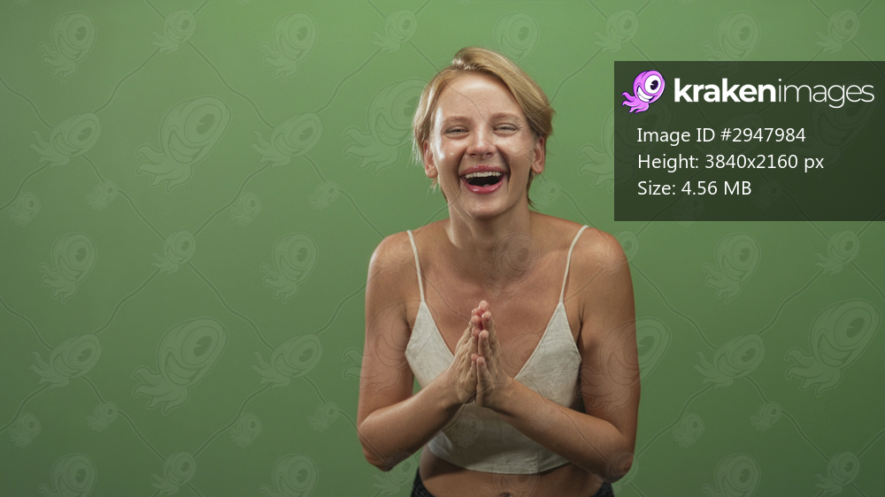 Caucasian blond woman laughing with hands clasped and bare midriff, palms together gesture against green studio backdrop; joy gratitude.