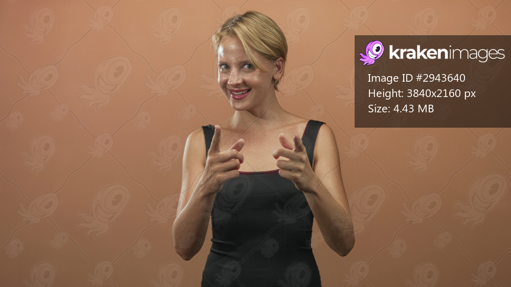 Caucasian blond woman pointing fingers and showing palms while smiling in studio wearing black tank top; playful invitation connection.