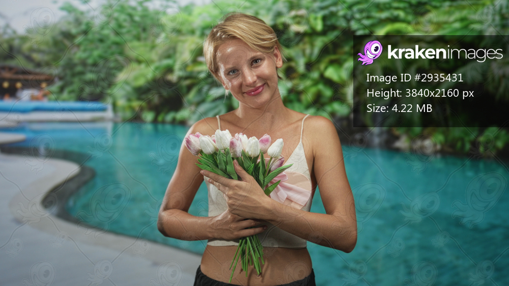 Caucasian blond woman smiling, holding tulip bouquet to chest at turquoise pool beside a building with tropical foliage; vacation joy.