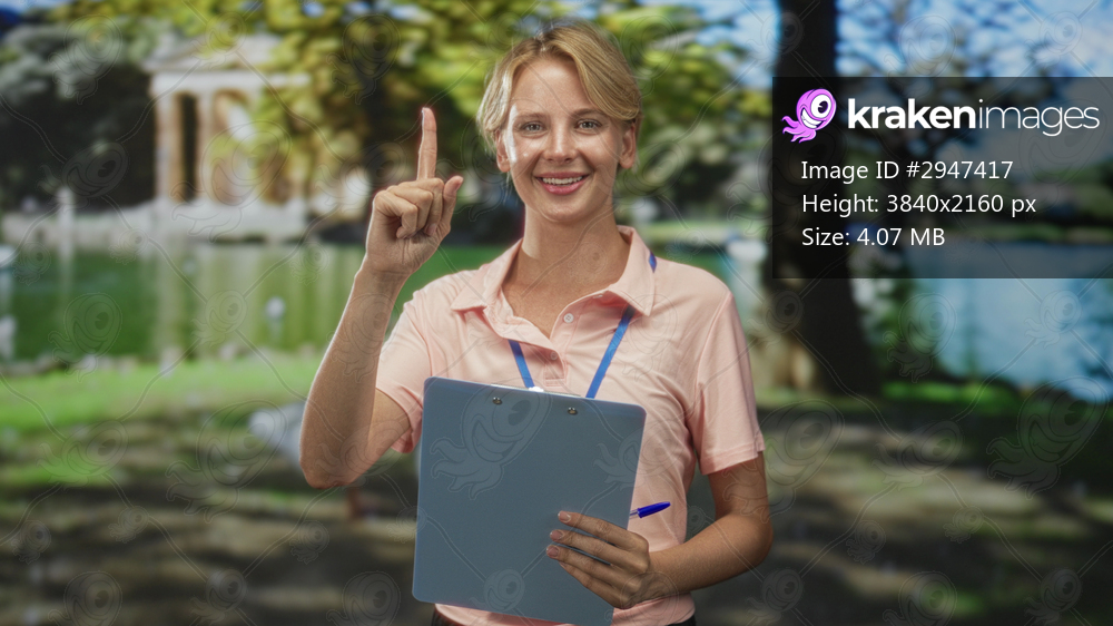 Caucasian blond woman trainer smiles and points index finger up while holding clipboard and pen in park with pond backdrop; encouragement instruction.