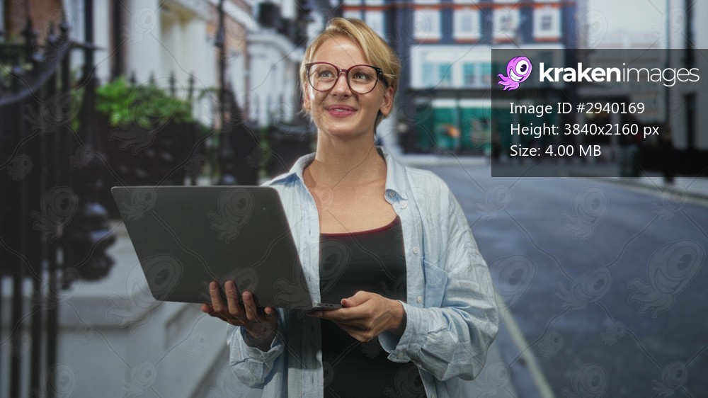 Caucasian blond woman wearing glasses and an open shirt, holding laptop with left hand, right hand on trackpad, smiling on a city street in front of building facades; remote work optimism. - Kraken Images