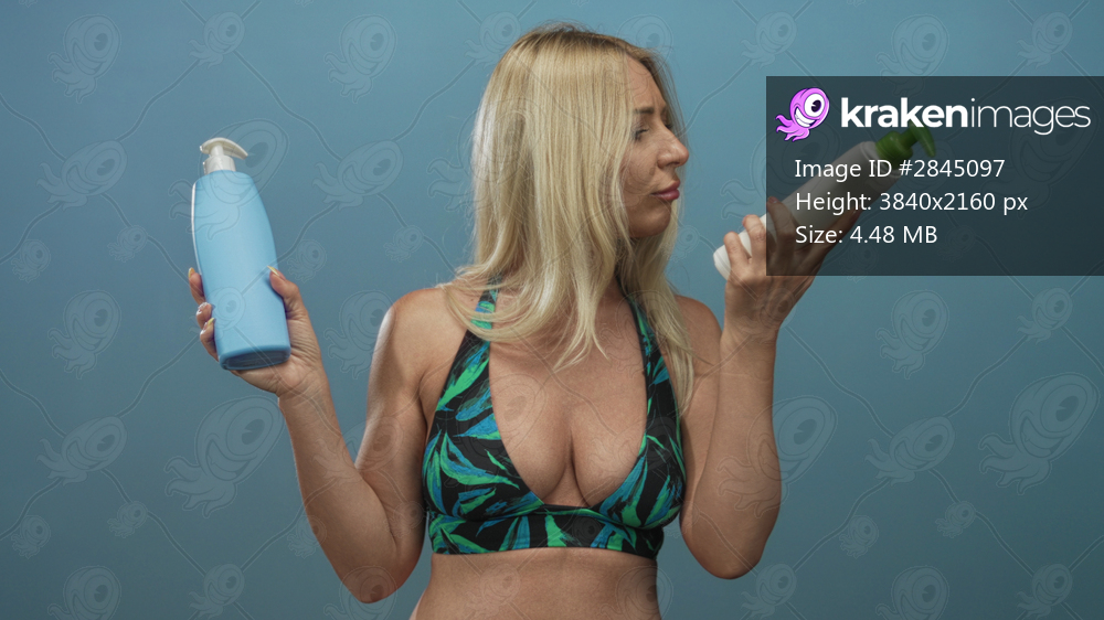 Caucasian blonde woman holds blue and white lotion bottles and displays cleavage in blue studio; uncertainty.