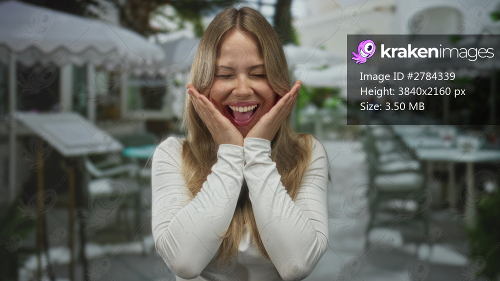 Caucasian blonde woman pointing finger at camera on restaurant terrace; surprise invitation excitement engagement.