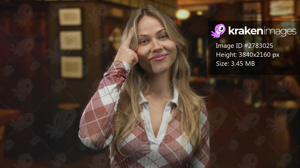 Caucasian blonde woman points finger to head in hotel while smiling and looking up; idea thinking cleverness ingenuity.