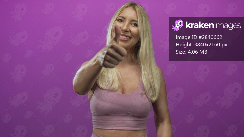 Caucasian blonde woman shows thumbs up gesture in purple studio; positivity motivation encouragement.