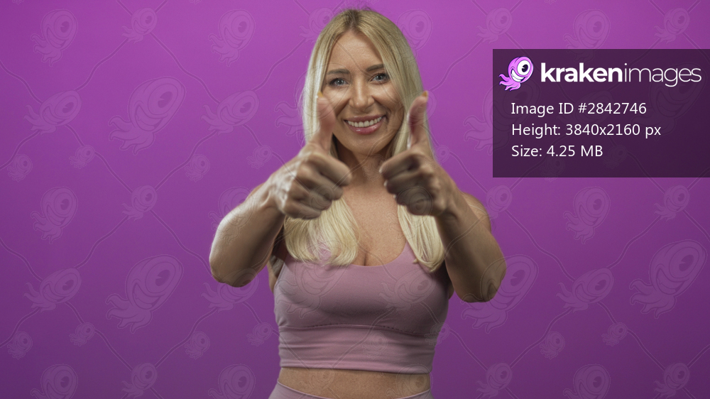 Caucasian blonde woman shows thumbs up gesture in purple studio; positivity motivation encouragement.