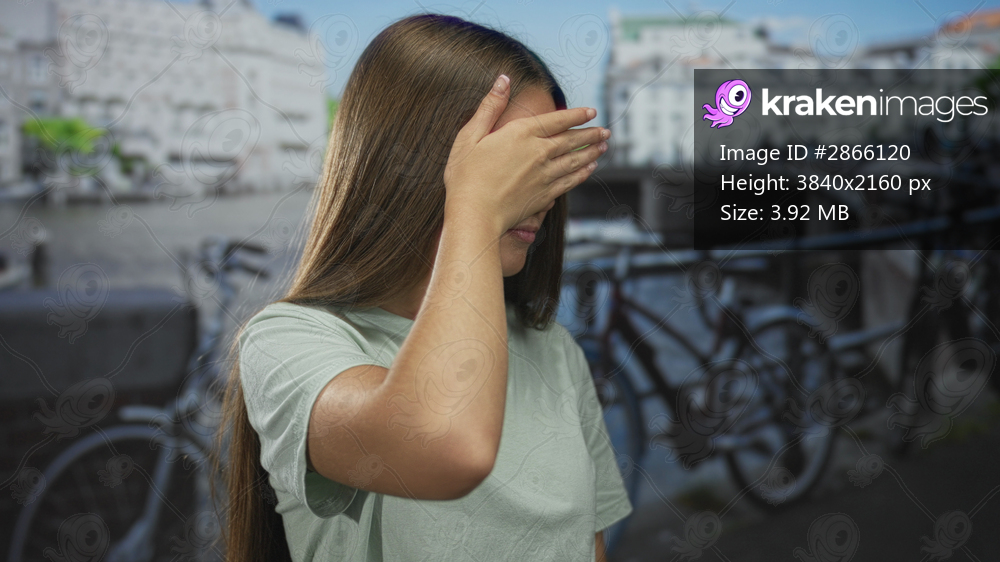 Caucasian girl hand covering eyes gesture on sunny canal street with bicycles and waterway view; shyness.
