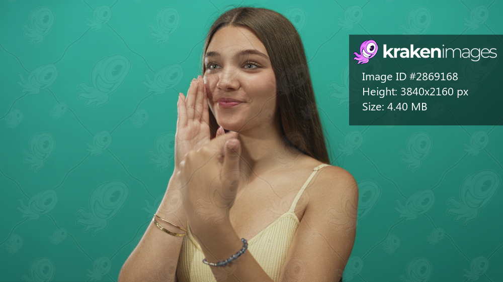 Caucasian girl with hand cupped to mouth shouting in a studio with a teal background; communication excitement.