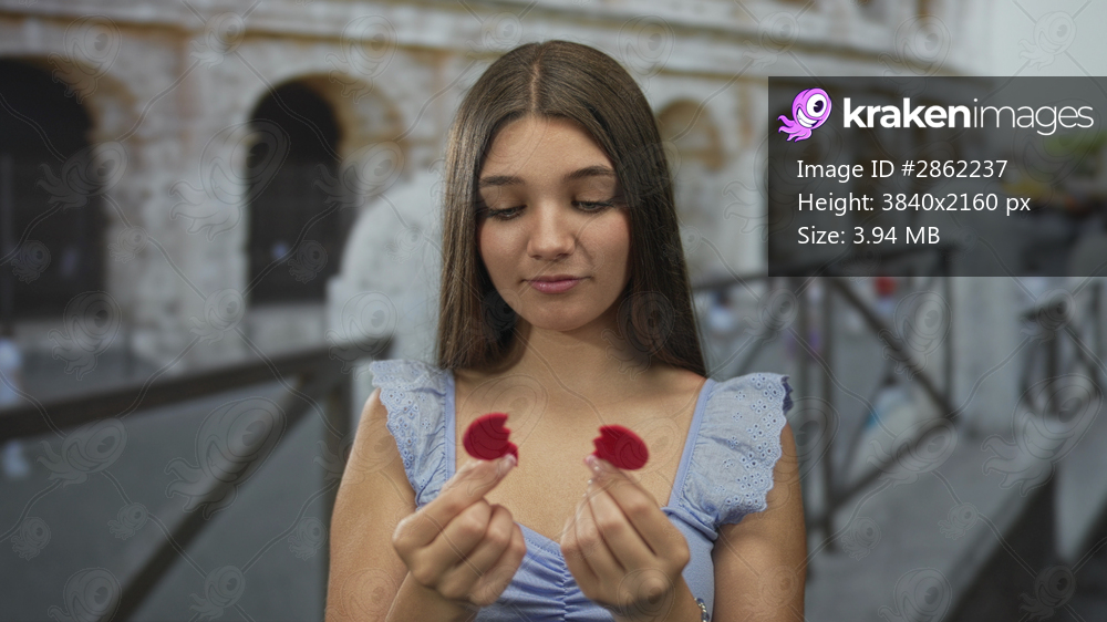Caucasian girl holds torn heart halves in bare hands at coliseum building with subtle sad expression; heartbreak relationship love.