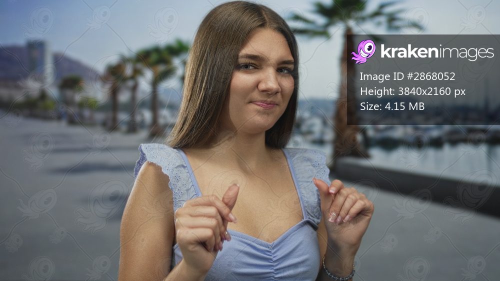 Caucasian girl in light blue dress pushes palms outward in rejecting gesture next to marina boat at port; disgust.
