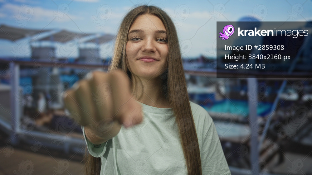 Caucasian girl in mint green shirt pumps fist by metal railing on sunny cruise deck; confidence celebration.