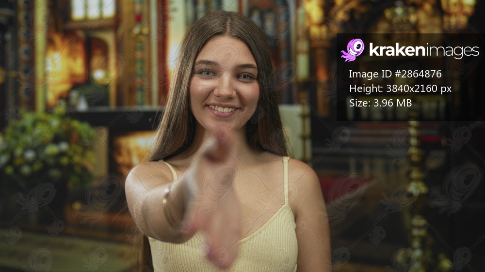 Caucasian girl reaches out hand with bare shoulders in catholic church near golden altar; serenity.