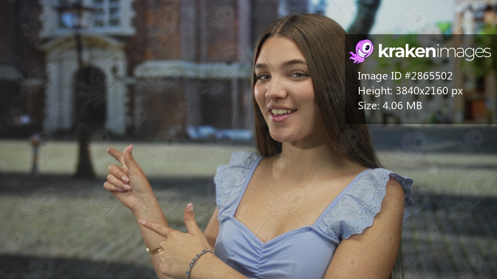 Caucasian girl smiling and pointing fingers with both hands in bustling sunlit historic street; confidence.