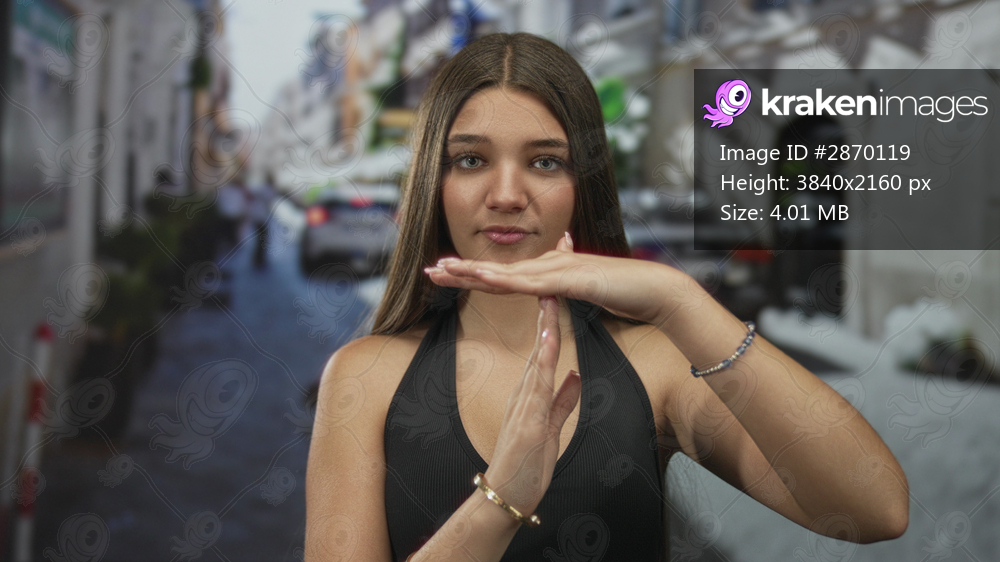 Caucasian girl wearing tank top forms time out gesture with hands in street; pause mindful reflection calm.