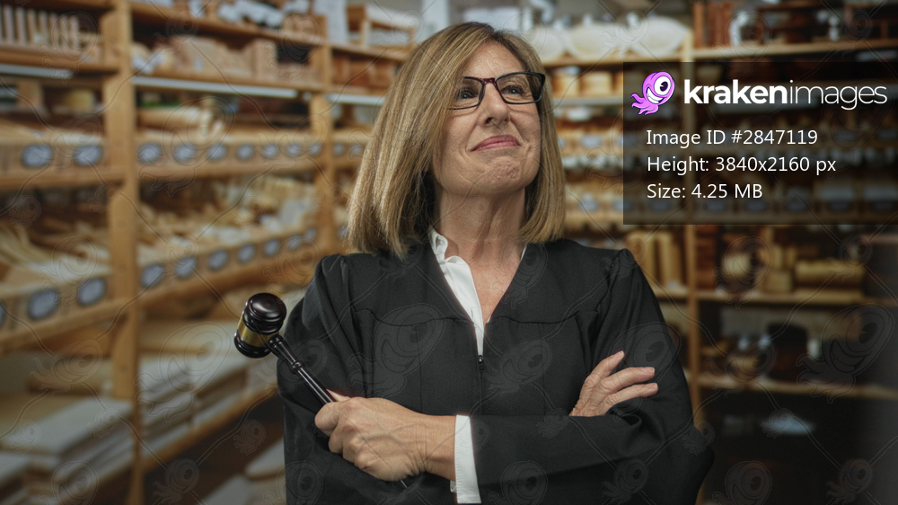 Caucasian judge holds wooden gavel indoors in rustic home decor shop; confidence authority leadership justice.
