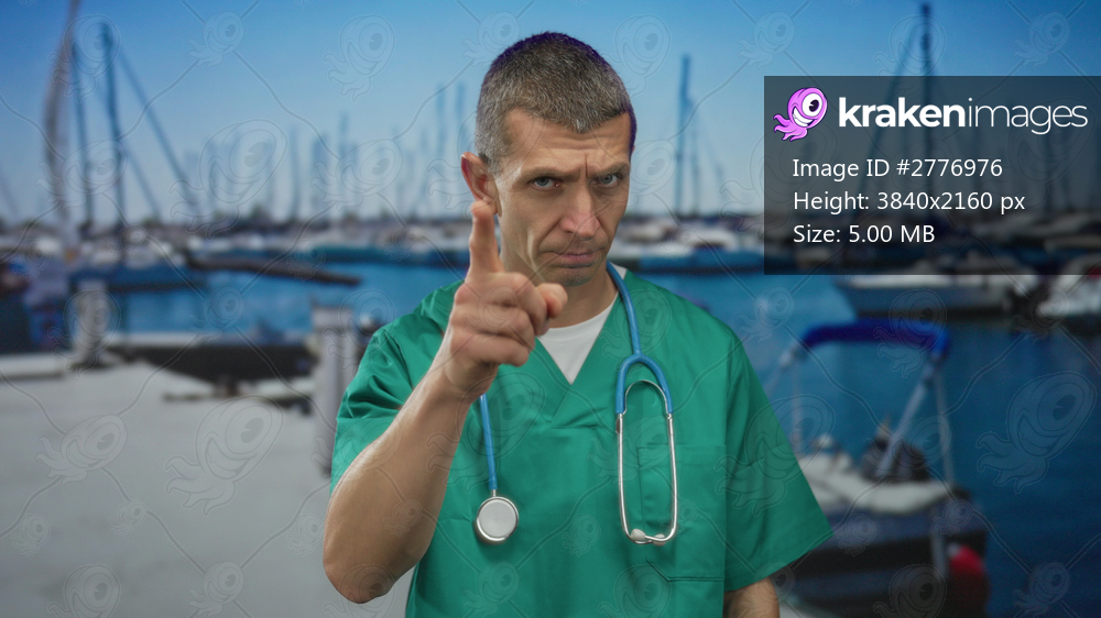 Caucasian male doctor with stethoscope wearing uniform points finger at camera by the seaside port with boats and marina background under clear outdoor sky. - Kraken Images