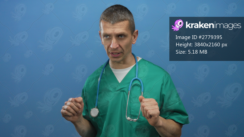 Caucasian male doctor wearing green uniform with stethoscope poses against a solid blue wall, exuding professionalism and confidence in an isolated setting. - Kraken Images