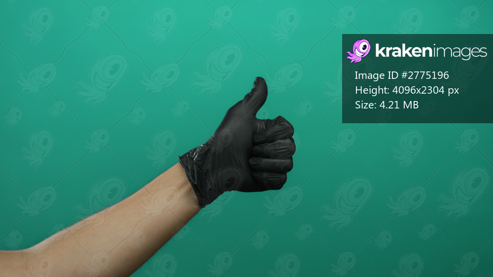 Caucasian male hand gives a thumbs up wearing a black glove against a solid green background illustrating approval and safety.