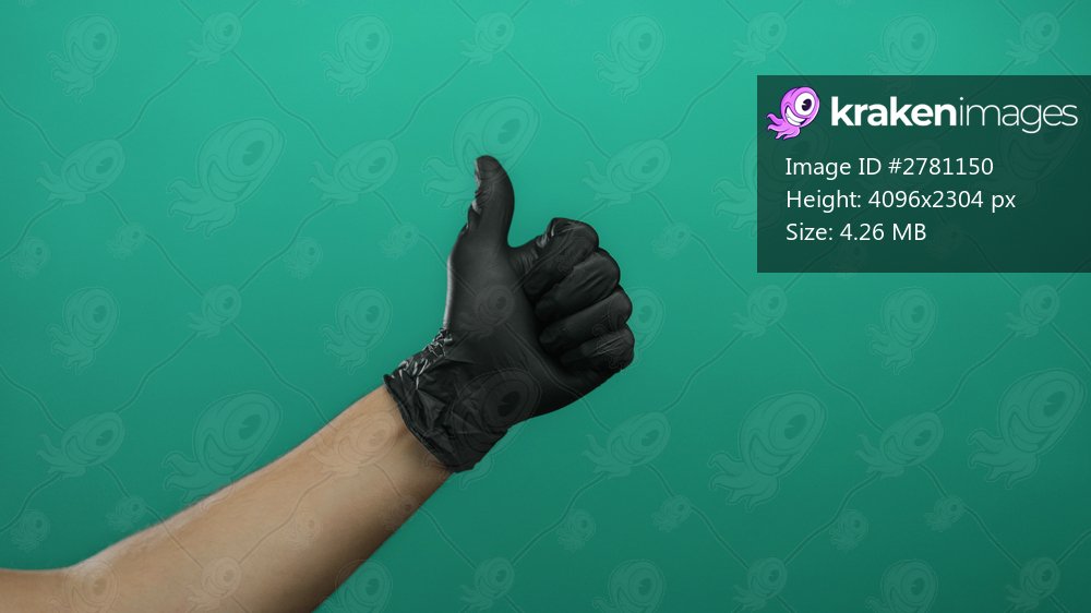 Caucasian male hand gives a thumbs up wearing a black glove against a solid green background illustrating approval and safety.